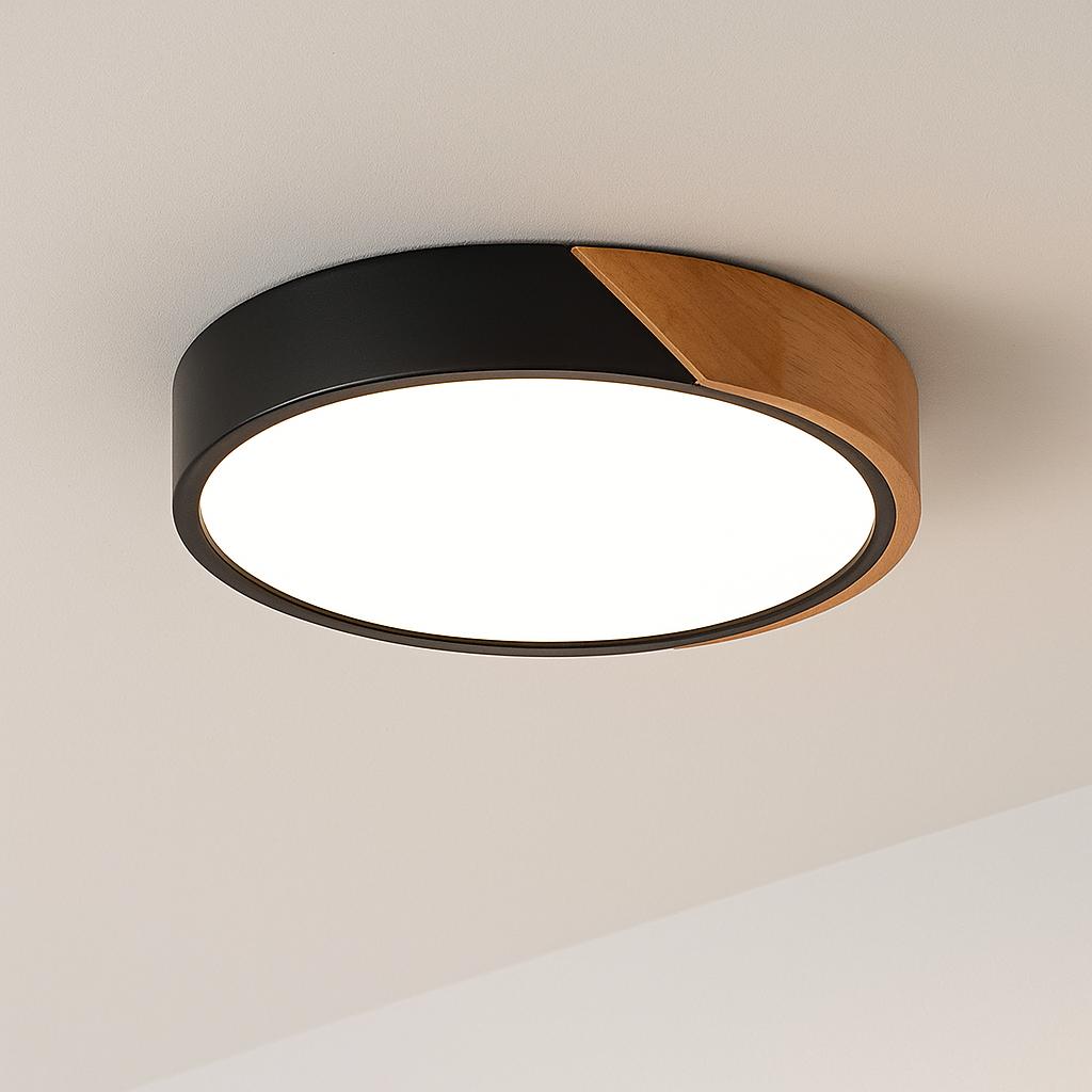 ✨ Tijdloos Scandinavisch design – strak rond armatuur met houten omlijsting, passend in minimalistische en klassieke interieurs